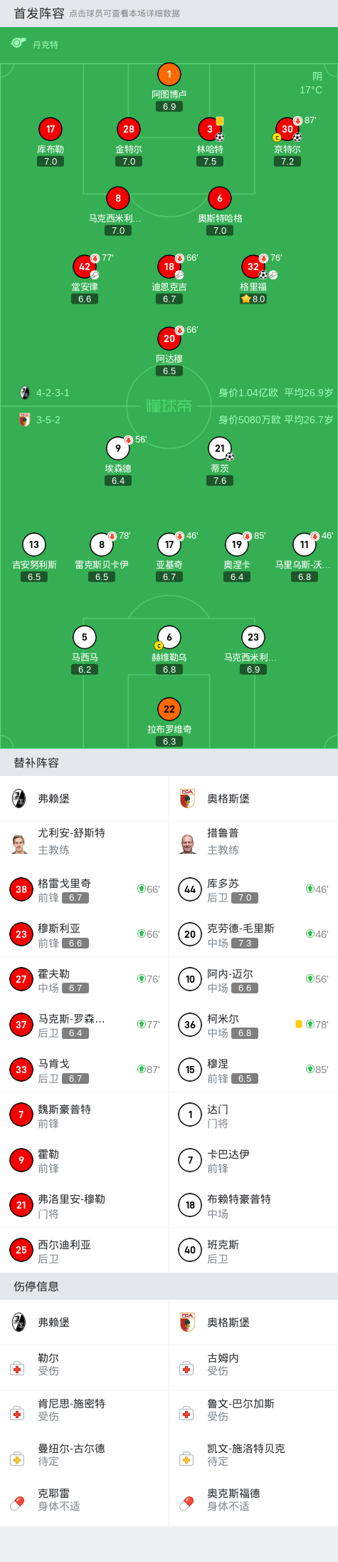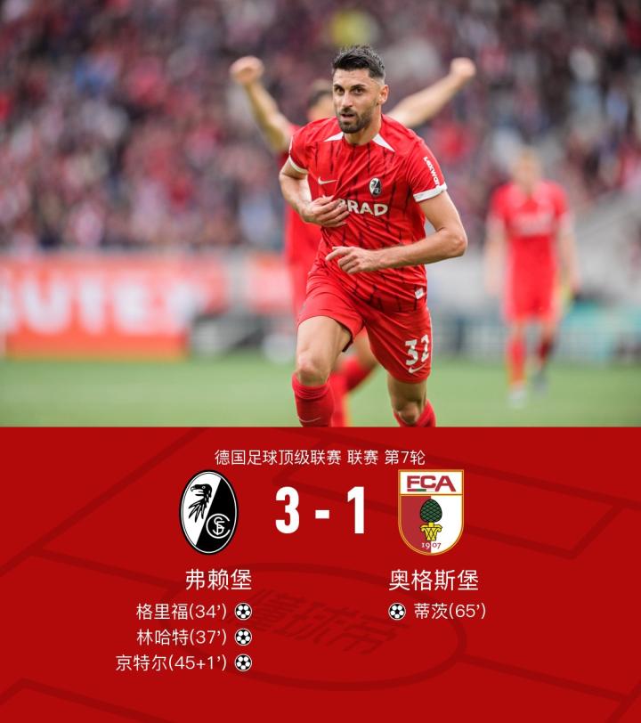 在德国足球顶级联赛第7轮的较量中,弗赖堡坐镇主场迎战奥格斯堡。比赛中,弗赖堡的迪恩克吉为格里福送出精妙助攻,帮助球队首开纪录。随后,格里福再次展现出色的组织能力,助攻林哈特再下一城。上半场结束前,堂安律为京特尔创造机会,后者成功破门,将比分进一步扩大。奥格斯堡方面,克劳德-毛里斯为蒂茨送出助攻,帮助球队扳回一城。最终,弗赖堡以3-1战胜奥格斯堡,取得胜利。