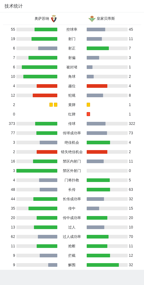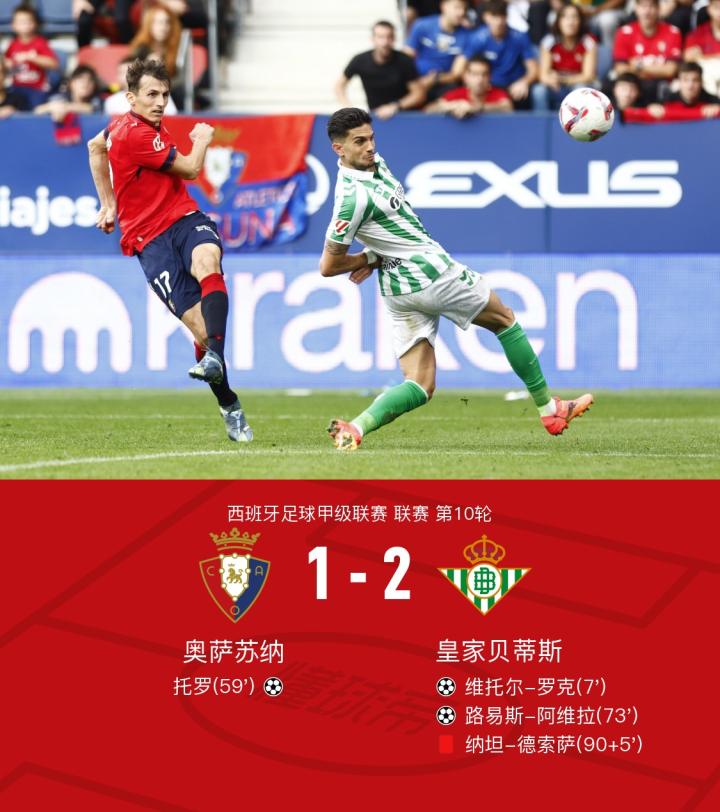 在西班牙足球甲级联赛第10轮的较量中,奥萨苏纳坐镇主场迎战皇家贝蒂斯。上半场,鲁伊瓦尔传中,罗克抢射破门帮助贝蒂斯取得领先,随后贝莱林传中,罗克脚后跟射门被对方门线解围,布季米尔头球攻门制造威胁;下半场,托罗破门为奥萨苏纳扳平比分,阿维拉补射破门帮助贝蒂斯再度领先,最后阶段纳坦-德索萨犯规经VAR确认后吃到红牌,但少打一人的贝蒂斯守住了战果,2-1从客场带走胜利。