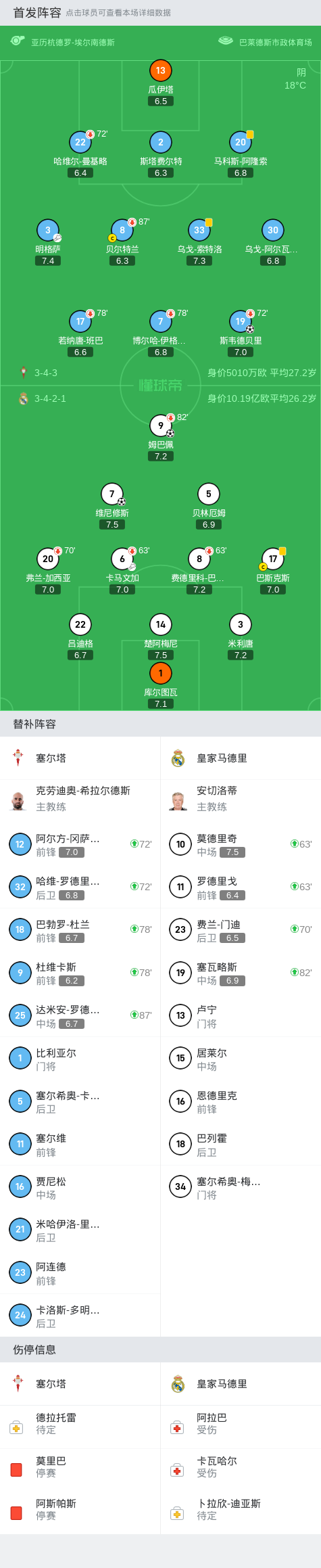 第20分钟,塞尔塔后场出球失误,姆巴佩禁区外兜射破门,皇马1-0