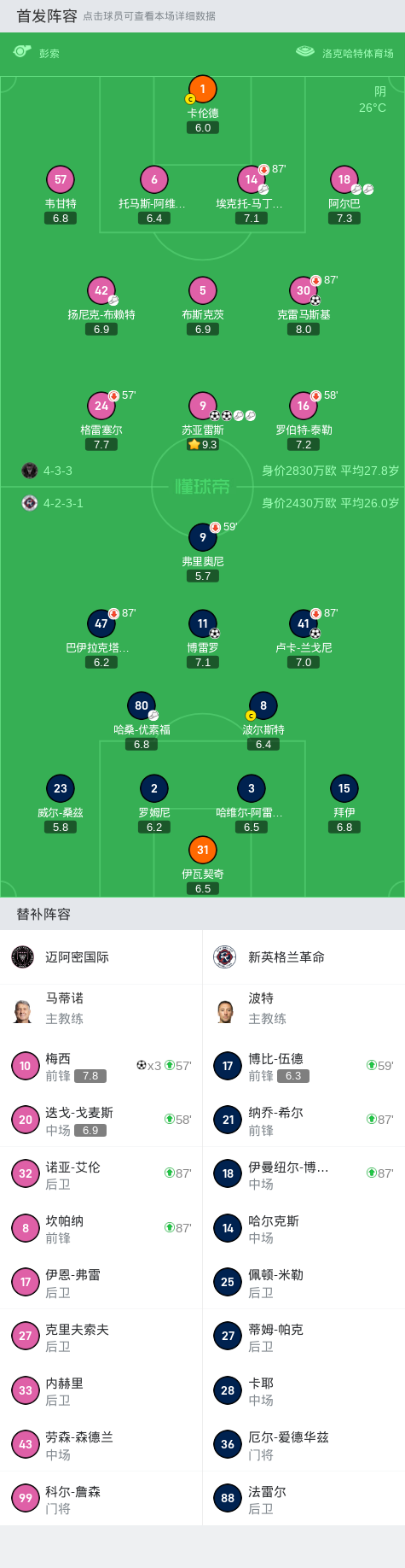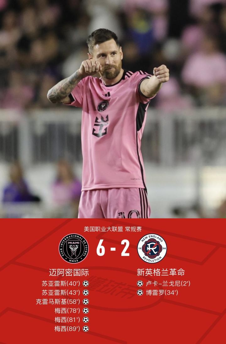 迈阿密国际6-2新英格兰革命,梅西替补出场戴帽,苏牙造4球