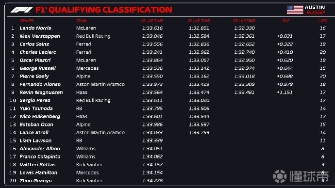 F1美国站排位赛:诺里斯再次夺杆,维斯塔潘第二,老汉止步Q1