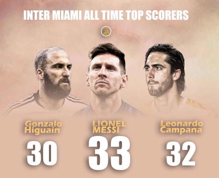 而通过本场比赛的帽子戏法,梅西超越队友坎帕纳的32球,独享迈阿密国际射手王。此外,伊瓜因曾为球队打入30个进球。