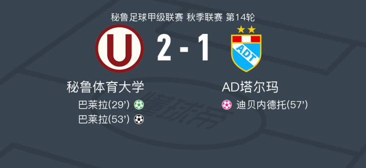 秘鲁体育大学2-1AD塔尔玛取秘鲁甲6连胜,巴莱拉包办2球