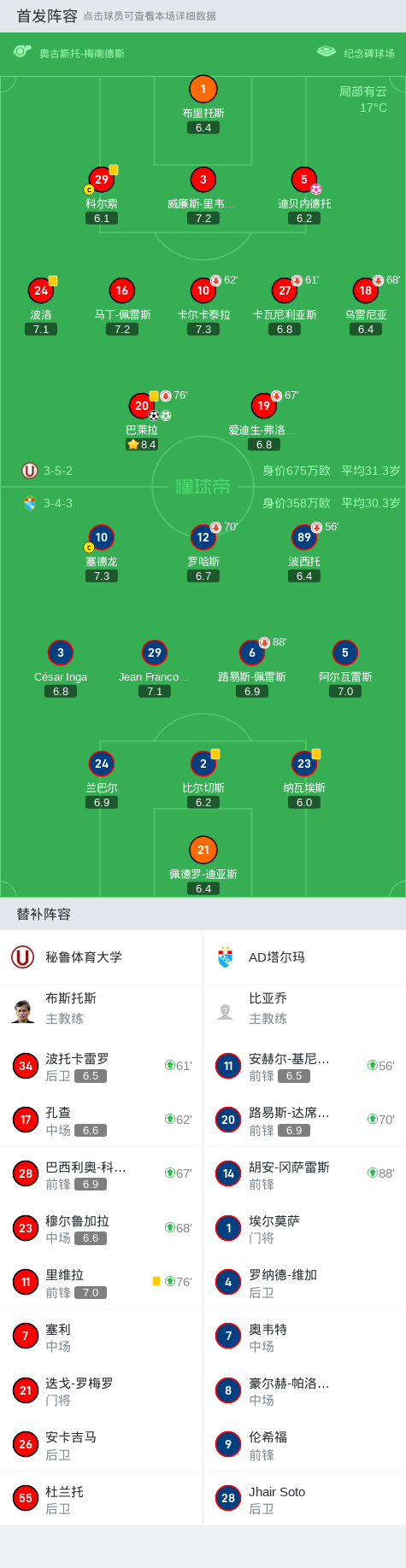 在秘鲁足球甲级联赛秋季联赛第14轮的比赛中,秘鲁体育大学坐镇主场迎战AD塔尔玛。比赛中,秘鲁体育大学的巴莱拉表现出色,成功打入两球,展现了出色的进攻能力。然而,比赛中也出现了意外,迪贝内德托不慎自摆乌龙,为对手贡献了一分。最终,秘鲁体育大学以2-1战胜AD塔尔玛,取得了比赛的胜利。