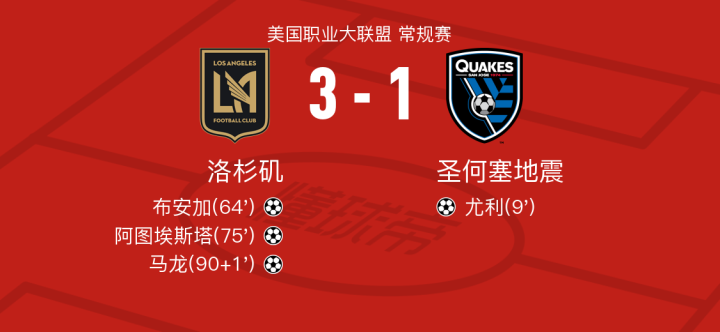 洛杉矶3-1逆转圣何塞地震取美职联5连胜,马龙建功,阿图埃斯塔替补1射1传