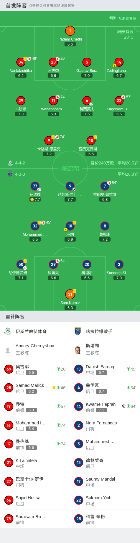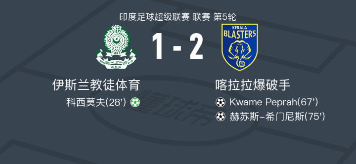 在印度足球超级联赛第5轮的较量中,伊斯兰教徒体育坐镇主场迎战喀拉拉爆破手。比赛中,伊斯兰教徒体育的科西莫夫通过点球为球队首开纪录。然而,喀拉拉爆破手随后展开反击,萨达维助攻Kwame Peprah扳平比分。接着,胡伊德罗姆-辛格为赫苏斯-希门尼斯送出助攻,帮助喀拉拉爆破手反超。最终,喀拉拉爆破手以2比1战胜伊斯兰教徒体育,取得胜利。