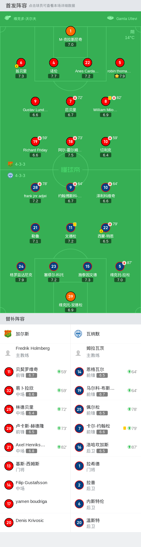 加尔斯0-0瓦纳默,难分伯仲战报bot @懂球帝2024-10-21 00:22在瑞典足球超级联赛第27轮的较量中,加尔斯坐镇主场迎战瓦纳默。经过一场激烈的对决,双方均未能攻破对方球门,比赛以0-0的比分收场。两队在场上展现了顽强的防守和不懈的拼搏精神,尽管创造了多次进攻机会,但始终未能将其转化为进球。比赛结束后,加尔斯和瓦纳默各自收获一分。点击查看本场比赛详细数据>>点击查看瑞典超完整积分榜>> 球队阵容 技术统计 展开更多