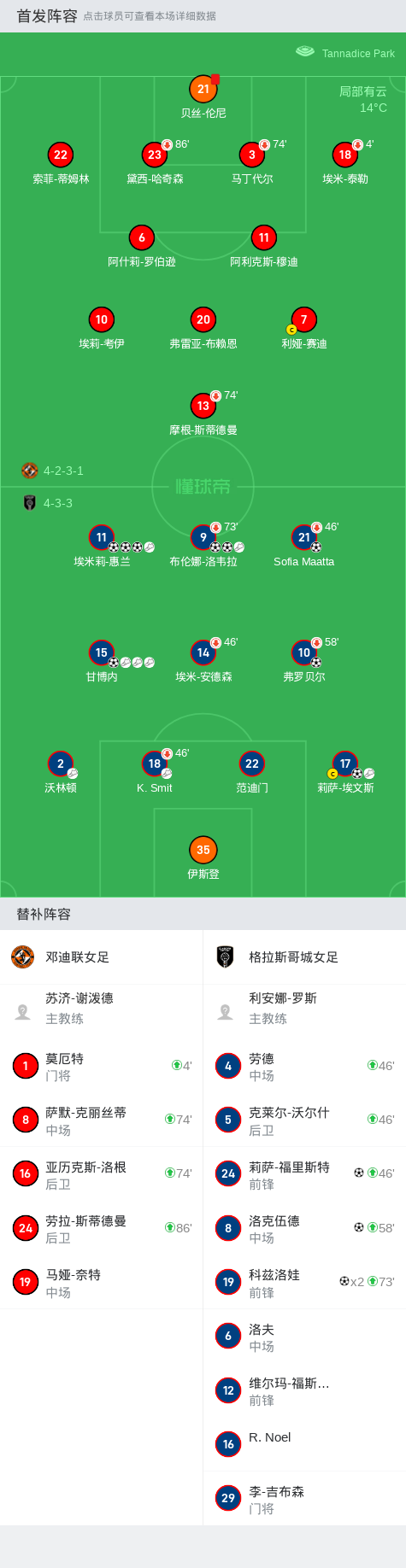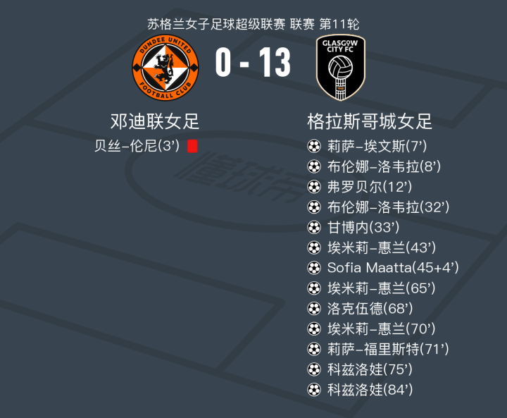 在苏格兰女子足球超级联赛第11轮的比赛中,邓迪联女足坐镇主场迎战格拉斯哥城女足。比赛一开始,邓迪联女足便遭遇不利局面,格拉斯哥城女足迅速展开攻势。莉萨-埃文斯率先为客队打破僵局,紧接着布伦娜-洛韦拉接连两次攻破对方球门,展现出强大的进攻火力。 弗罗贝尔在莉萨-埃文斯的助攻下也取得进球,进一步扩大了比分差距。随后,甘博内和埃米莉-惠兰的出色表现让格拉斯哥城女足的优势更加明显。Sofia Maatta、洛克伍德、莉萨-福里斯特和科兹洛娃也纷纷建功,科兹洛娃更是完成了梅开二度的壮举。 整场比赛,格拉斯哥城女足展现了无与伦比的进攻实力,最终以13比0的大比分战胜邓迪联女足,取得了一场酣畅淋漓的胜利。