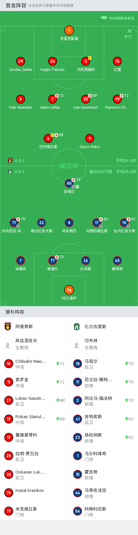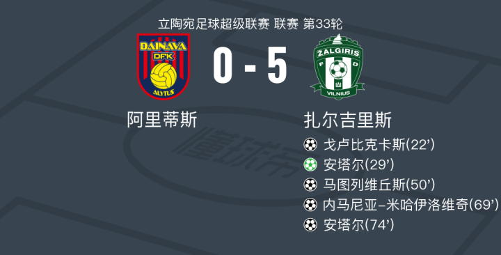 扎尔吉里斯5-0狂胜阿里蒂斯取立陶超4连胜,安塔尔双响,内马尼亚-米哈伊洛维奇建功