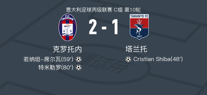 在意大利足球丙级联赛C组第10轮的较量中,克罗托内坐镇主场迎战塔兰托。比赛中,塔兰托的Cristian Shiba率先为球队取得进球。随后,克罗托内的若纳坦-席尔瓦扳平比分,紧接着特米勒罗再下一城,帮助克罗托内反超。最终,克罗托内以2-1战胜塔兰托,取得了本场比赛的胜利。