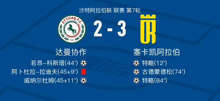 塞卡凯阿拉伯3-2达曼协作,特略梅开二度,古德蒙德松建功