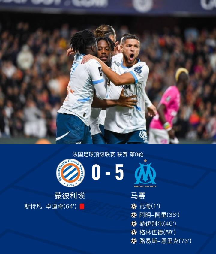 北京时间10月21日2:45,法甲第8轮,马赛客场挑战蒙彼利埃。上半场,瓦希头球破门,乔纳森-罗头球攻门被门将没收,赫伊别尔远射打偏,阿明-阿里抽射破门扩大比分,格林伍德助攻赫伊别尔推射建功。下半场,瓦希门前扫射击中立柱,格林伍德小角度破门,斯特凡-卓迪奇铲倒阿明-阿里被红牌罚下,诺尔丹单刀兜射打偏,路易斯-恩里克推射建功,格林伍德破门被吹越位在先,最终,马赛客场5-0大胜蒙彼利埃。