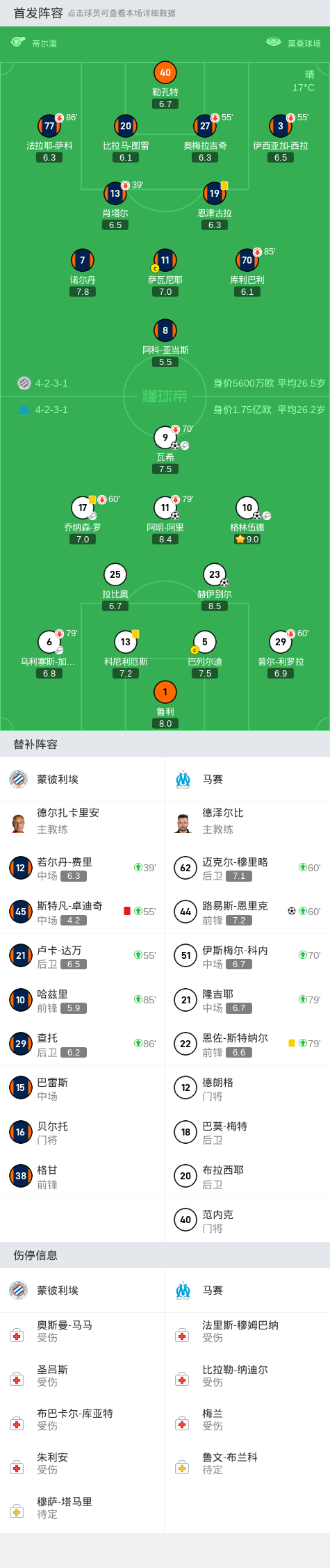 马赛5-0十人蒙彼利埃,格林伍德、瓦希传射,赫伊别尔建功