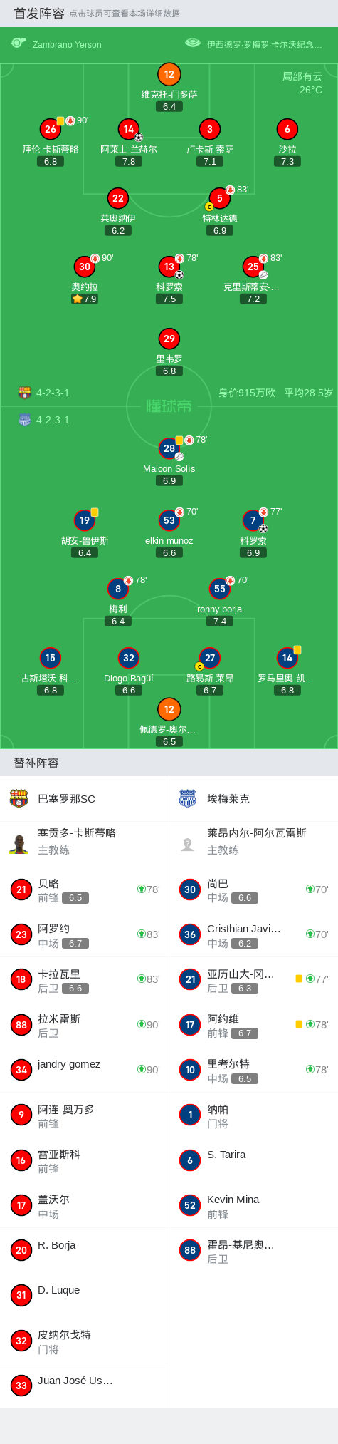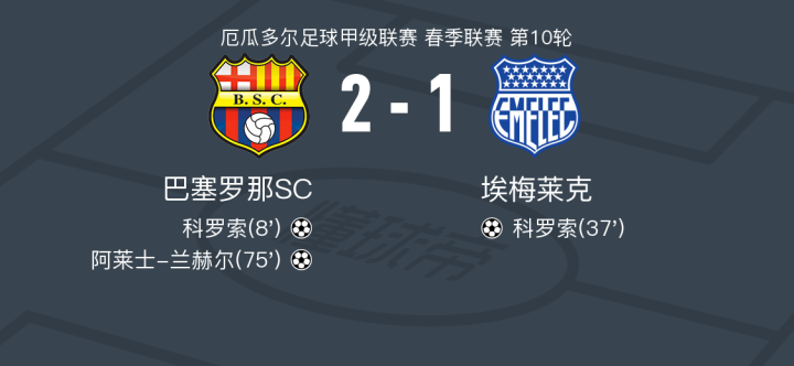 在厄瓜多尔足球甲级联赛春季联赛第10轮的比赛中,巴塞罗那SC坐镇主场迎战埃梅莱克。比赛中,巴塞罗那SC的科罗索率先为球队取得领先。随后,埃梅莱克的科罗索在Maicon Solís的助攻下扳平比分。比赛接近尾声时,巴塞罗那SC的克里斯蒂安-索拉诺助攻阿莱士-兰赫尔,再次为主队取得领先。最终,巴塞罗那SC以2-1战胜埃梅莱克,赢得了这场激烈的对决。