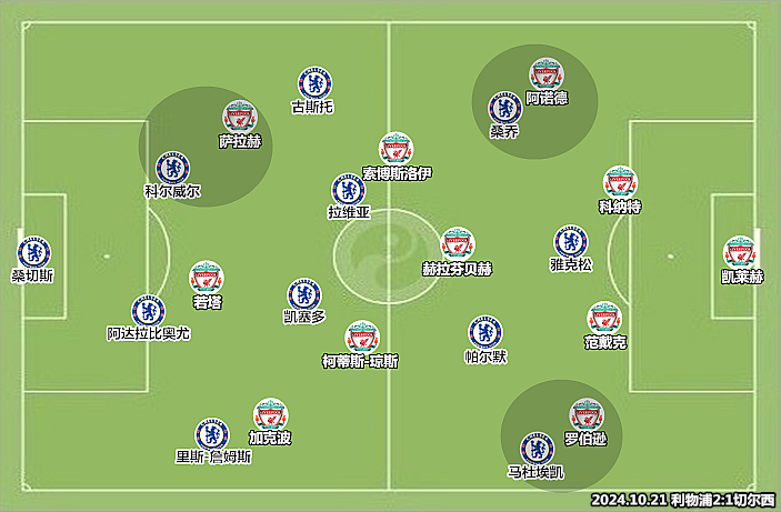 上半场当帕尔默与马杜埃凯尝试配合时,若塔和加克波总会出现在他们身边;当雷纳托-韦加和内托合力冲击阿诺德时,萨拉赫站在了右后卫位置上;努涅斯替补现身后燃爆全场,乌拉圭人的一系列表现严重影响了蓝军球员的心态。克洛普时代的红军以锋线带动三线轮转,红箭三侠在前场压迫对手时的表现成为了一个时代的标志,斯洛特的战术让人们意识到,萨拉赫和努涅斯等人出现在后场时同样可以影响比赛走势。