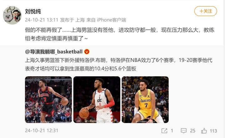 辽宁自媒体博主“导演我躺哪_basketball”发文称上海久事男篮签下新外援特洛伊.布朗,五星体育(上海媒体)记者刘悦纯在今日站出来辟谣,他表示:“假的不能再假了……上海男篮没有签他,进攻防守都一般,现在压力那么大,教练组考虑肯定慎重再慎重了~”