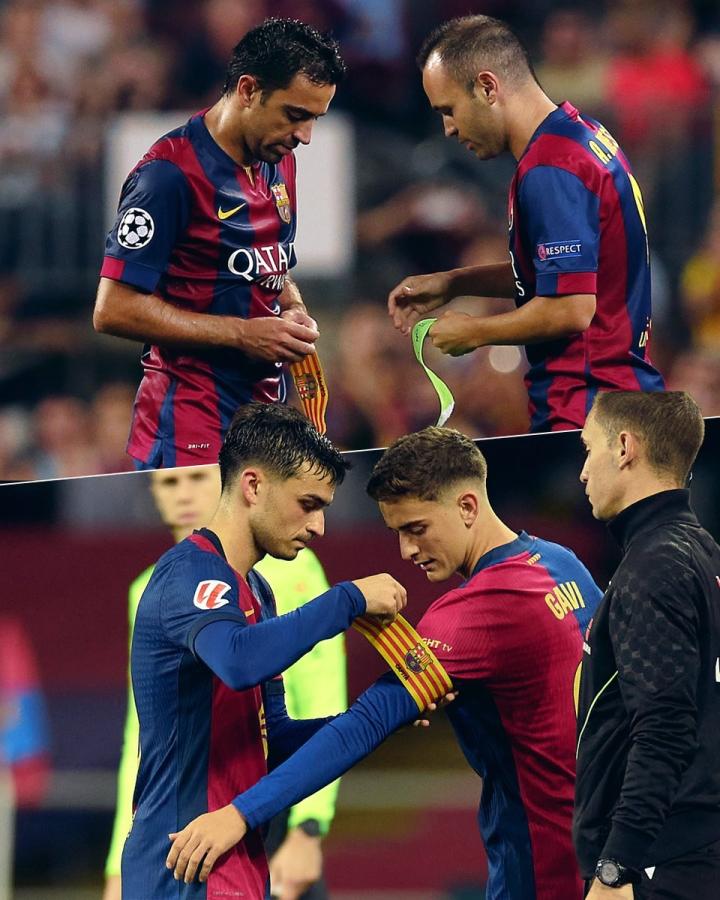 佩德里→加维,巴萨官方晒照对比小白给哈维戴队长袖标一幕