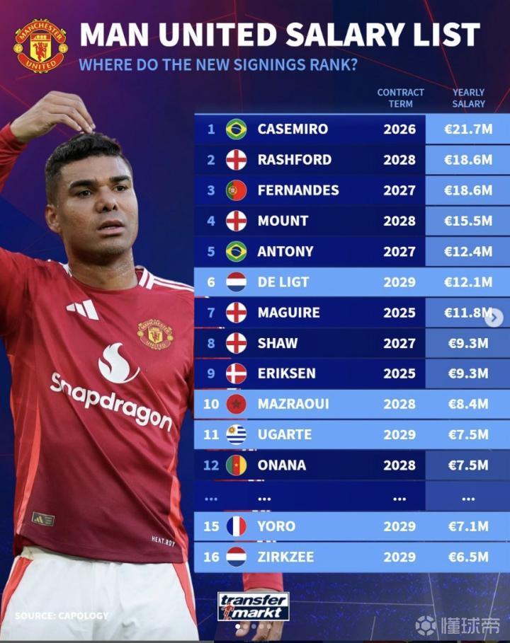 7、马奎尔,合同有效期至2025年,年薪1180万欧元