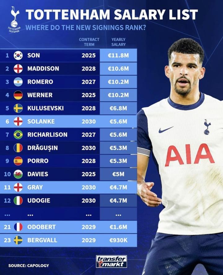 德转统计出了托特纳姆热刺2024-25赛季球队新援的税前年薪,索兰克以560万欧元排名队内第6,阿奇-格雷470万欧元队内第11位,奥多贝尔160万欧元队内第21位,卢卡斯-贝里瓦尔仅93万欧元队内第23位。