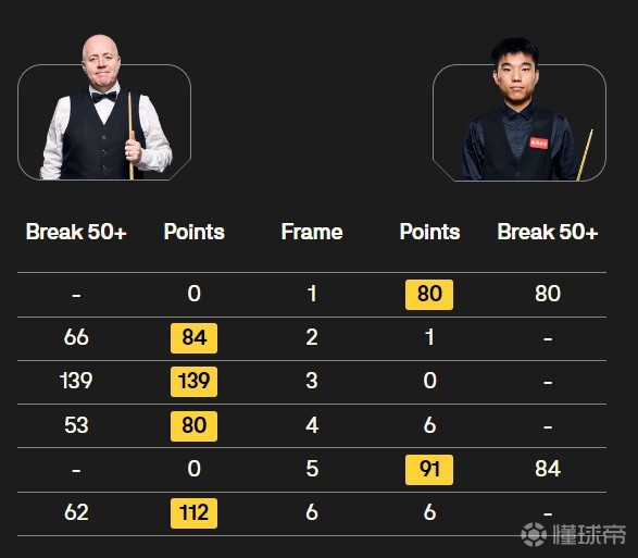 全场比赛范争一打出两杆50+(80、84),希金斯打出一杆破百(139)和三杆50+(66、53、62)。