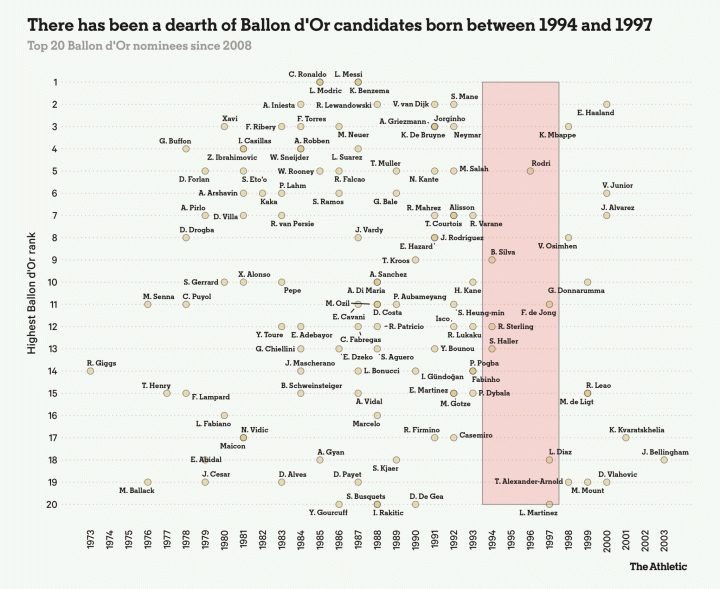 该年龄组其他入围过前20名是弗朗基-德容(2019年第11名)、斯特林(2019年第12名,2021年第15名)、塞巴斯蒂安-阿莱(2022年第13名)、路易斯-迪亚斯(2022年第18位)、劳塔罗-马丁内斯(2023年第20名)——除了劳塔罗,今年的30位提名无人在列;