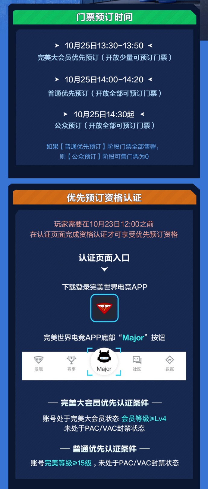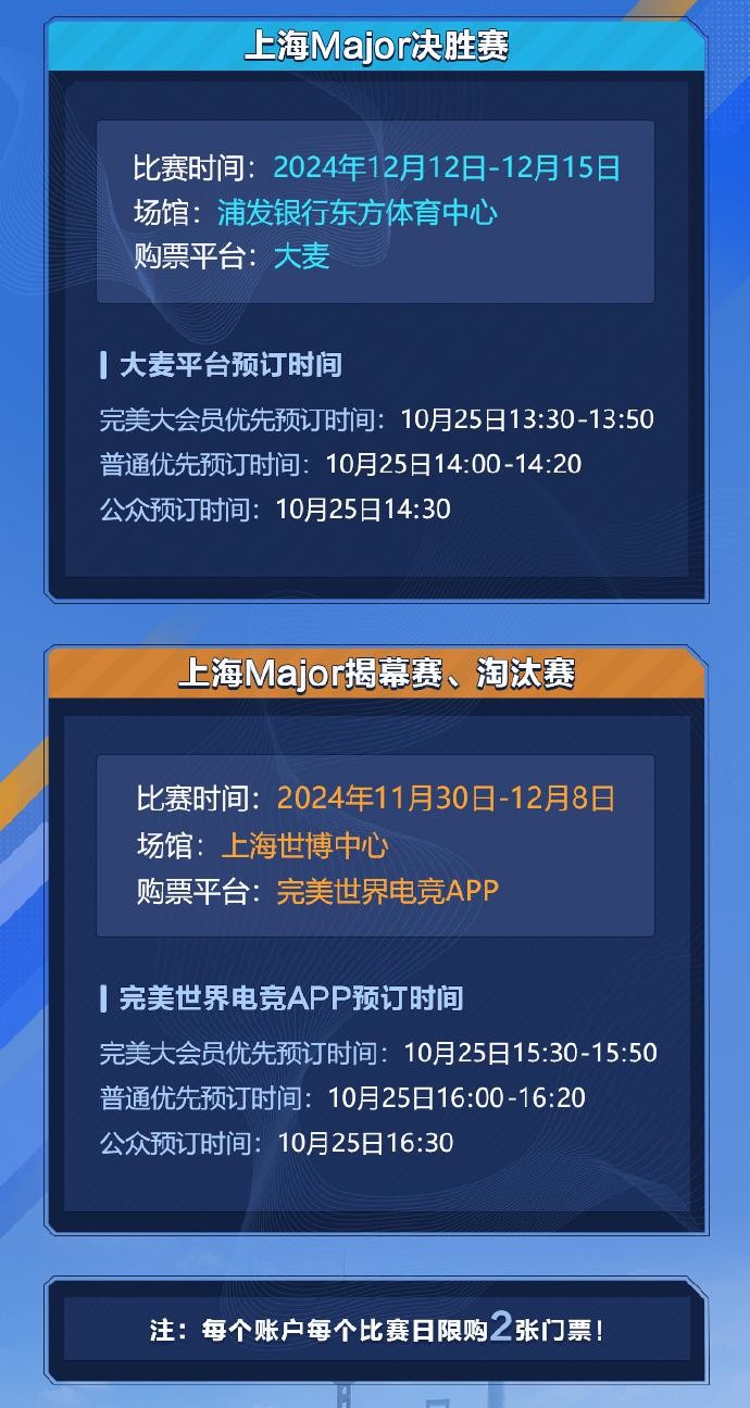 北京时间10月22日晚,上海完美世界Major发布赛事票务信息,决胜赛(8强阶段)单日票价由299元-1599元,10月25日下午正式开票。