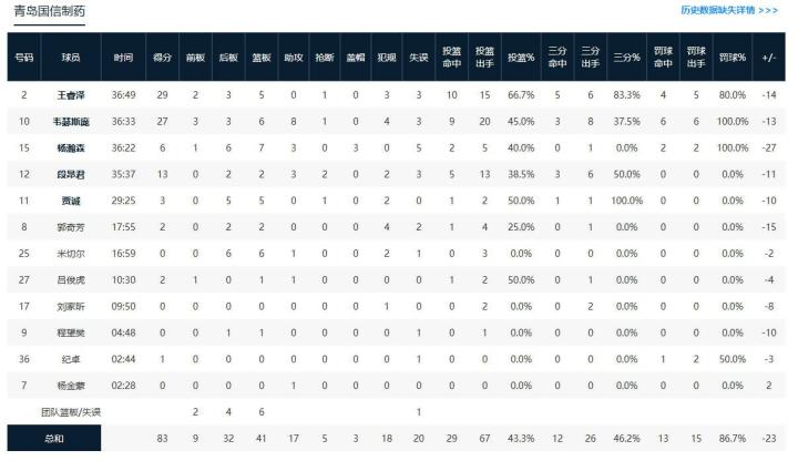 青岛国信制药王睿泽29分5板1断,奎因达里-韦瑟斯庞27分6板8助1断,段昂君13分2板3助2断。