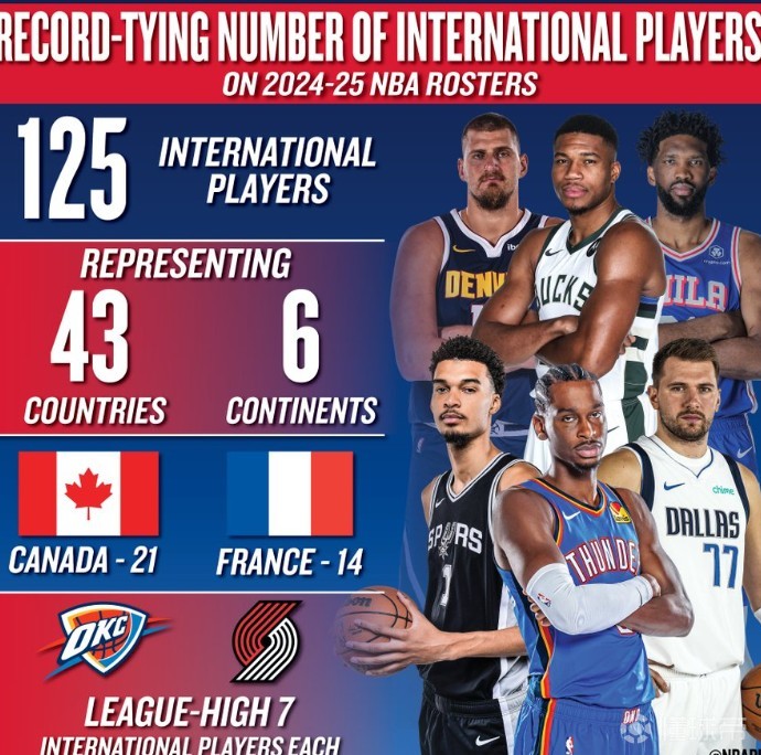 北京时间10月22日,美国职业篮球联赛 (NBA) 今天宣布,2024-25赛季NBA揭幕战球员名单上有来自六大洲43个国家的125名国际球员,创下纪录。