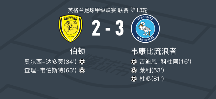 韦康比流浪者3-2伯顿,杜多破门,莱利建功