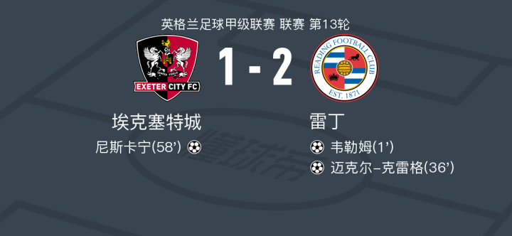 雷丁2-1埃克塞特城,迈克尔-克雷格建功,韦勒姆破门