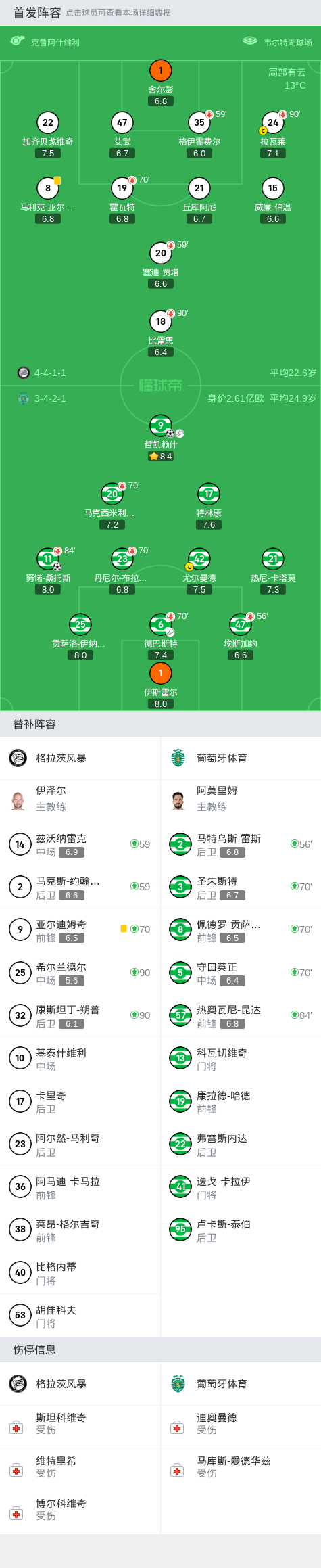第53分钟,葡萄牙体育球员德巴斯特助攻哲凯赖什打入一球。