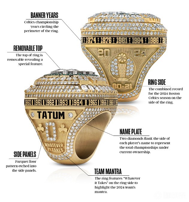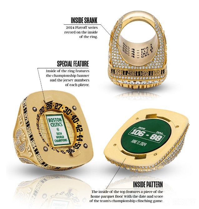 戒指一侧的球队还拥有2024年波士顿凯尔特人队的总战绩(80-21)。