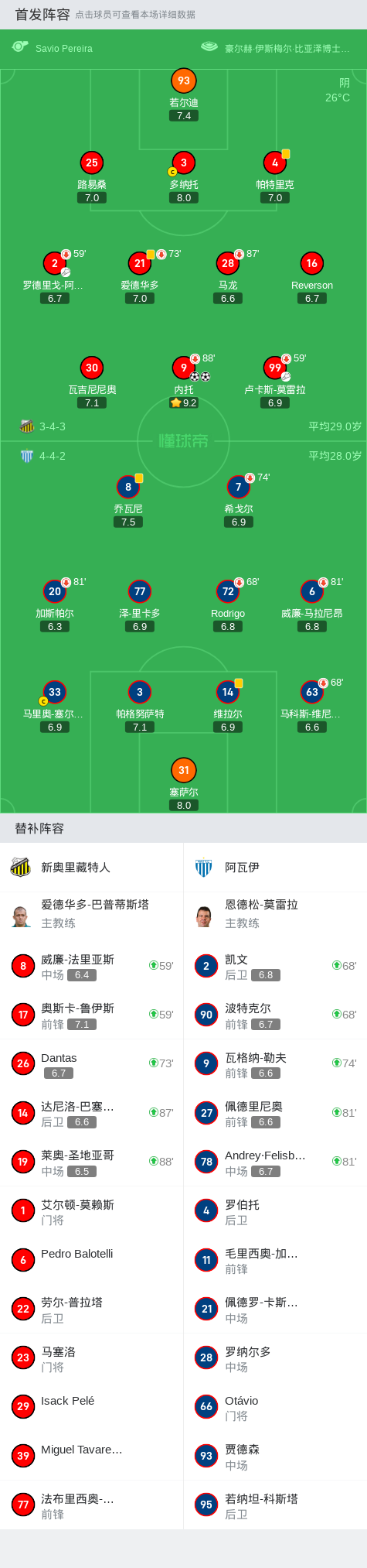 新奥里藏特人2-0阿瓦伊,内托独中两元