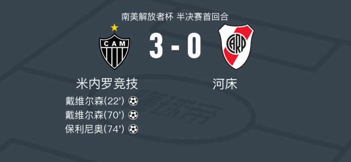 米内罗竞技3-0大胜河床,戴维尔森两球,保利尼奥破门