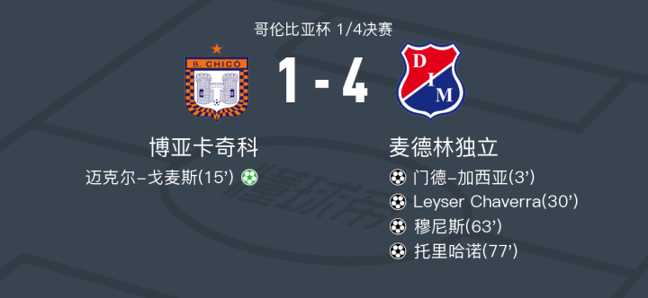 在哥伦比亚杯1/4决赛中,博亚卡奇科迎战麦德林独立。比赛中,麦德林独立的门德-加西亚率先为球队取得领先。博亚卡奇科的迈克尔-戈麦斯通过点球扳平比分。然而,麦德林独立的Leyser Chaverra、穆尼斯和托里哈诺相继进球,帮助球队扩大优势。最终,麦德林独立以4比1战胜博亚卡奇科,成功晋级。