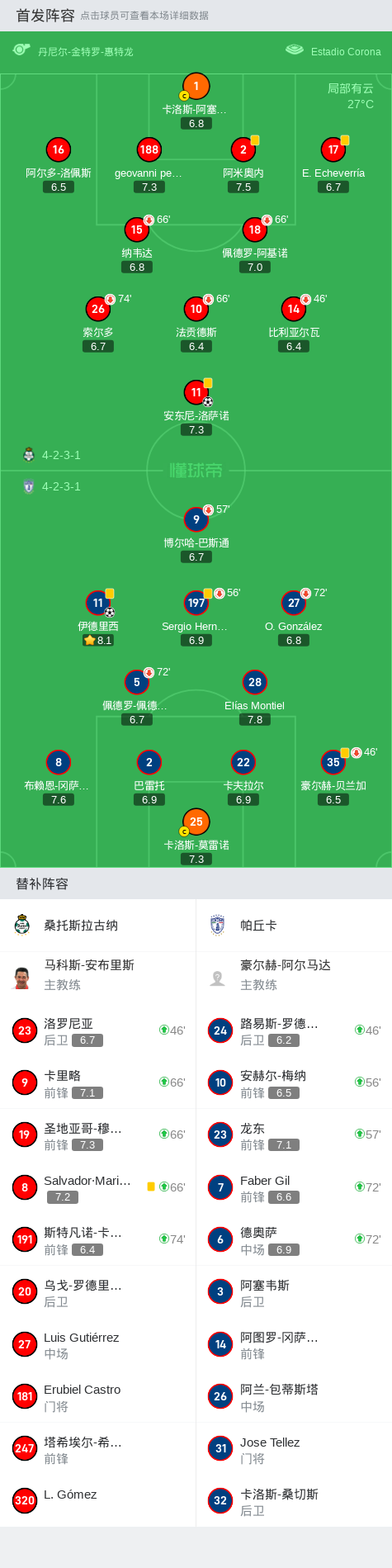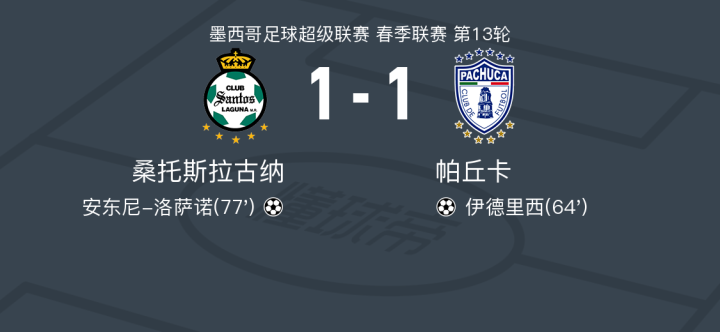 在墨西哥足球超级联赛春季联赛第13轮的较量中,桑托斯拉古纳坐镇主场迎战帕丘卡。比赛中,帕丘卡的龙东为伊德里西送出精妙助攻,后者成功破门,为客队取得领先。随后,桑托斯拉古纳的安东尼-洛萨诺展现出色的个人能力,打入扳平一球。最终,双方以1-1握手言和,未能分出胜负。