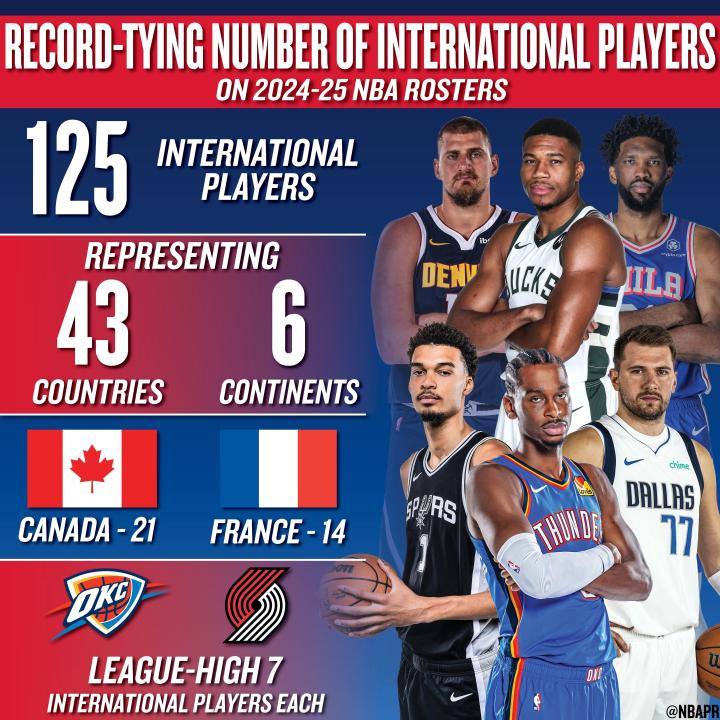 30支球队都拥有国际球员,其中雷霆和开拓者各有7人并列最多。老鹰、独行侠、雄鹿、火箭、魔术和猛龙拥有6人紧随其后。