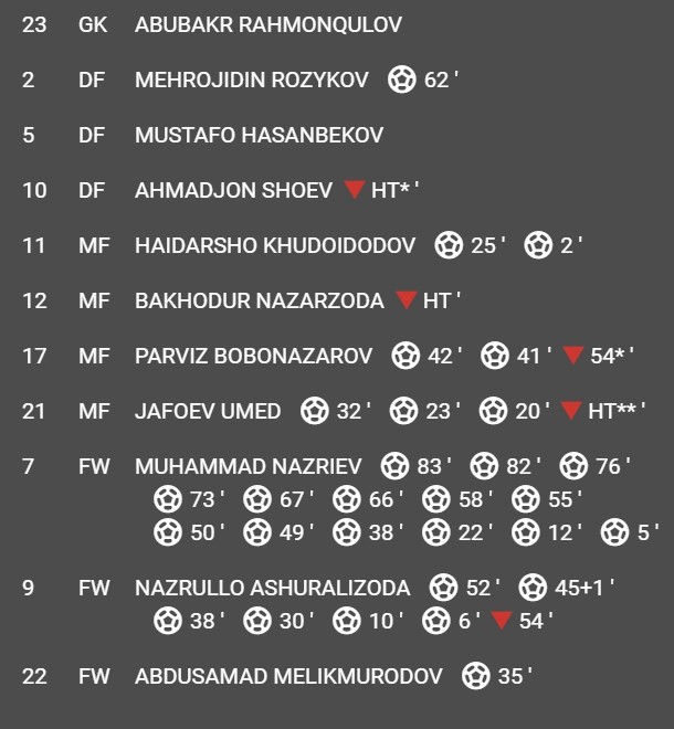 本场比赛,塔吉克斯坦7号球员穆罕默德-纳兹里耶夫一人打入14球,9号球员一人打入6球,21号球员上演帽子戏法,还有两人梅开二度,两人各进一球。