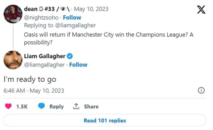 事实上,这一乐坛“世纪大和解”幕后也少不了曼城的功劳。2023年欧洲冠军联赛决赛之前,一位乐迷及球迷曾在某社媒询问,如果曼城首夺欧冠,绿洲乐队会否重组?弟弟利亚姆回答说:“我准备好了。”