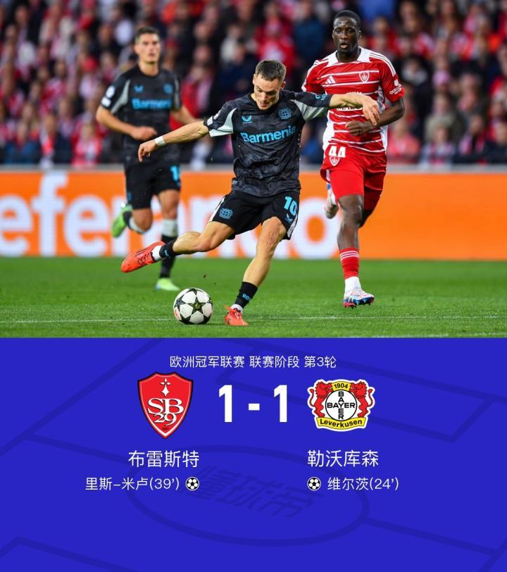 在欧洲冠军联赛小组赛的较量中,布雷斯特迎战勒沃库森。比赛中,勒沃库森的霍夫曼送出精妙助攻,维尔茨成功破门,为球队先拔头筹。随后,布雷斯特的里斯-米卢展现出色的个人能力,打入扳平一球。最终,双方以1-1握手言和,各取一分。