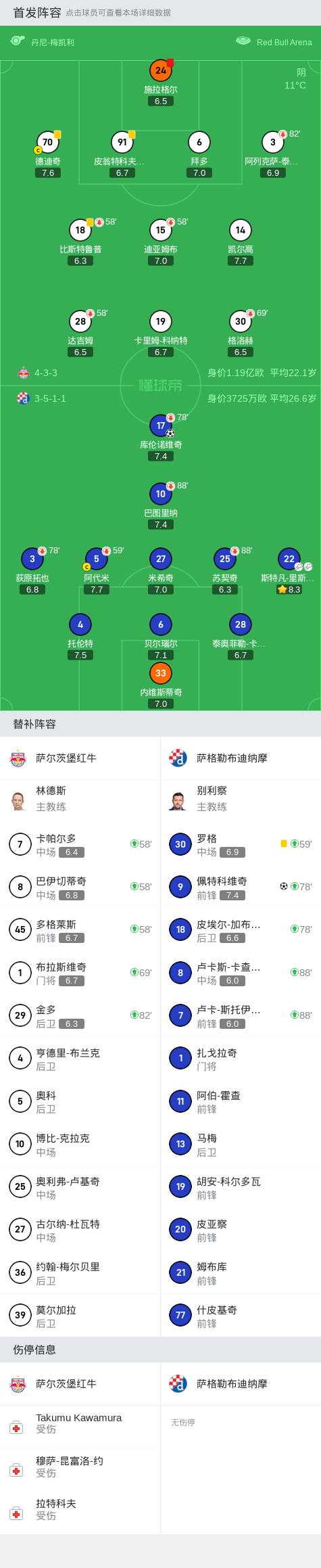 在欧洲冠军联赛小组赛的一场较量中,萨尔茨堡红牛迎战萨格勒布迪纳摩。比赛中,萨格勒布迪纳摩的斯特凡-里斯托夫斯基表现出色,他两次送出助攻,帮助库伦诺维奇和佩特科维奇分别攻入一球。比赛中,萨尔茨堡红牛的施拉格尔被罚下场,给球队带来了不小的压力。最终,萨格勒布迪纳摩以2比0战胜对手,取得了比赛的胜利。