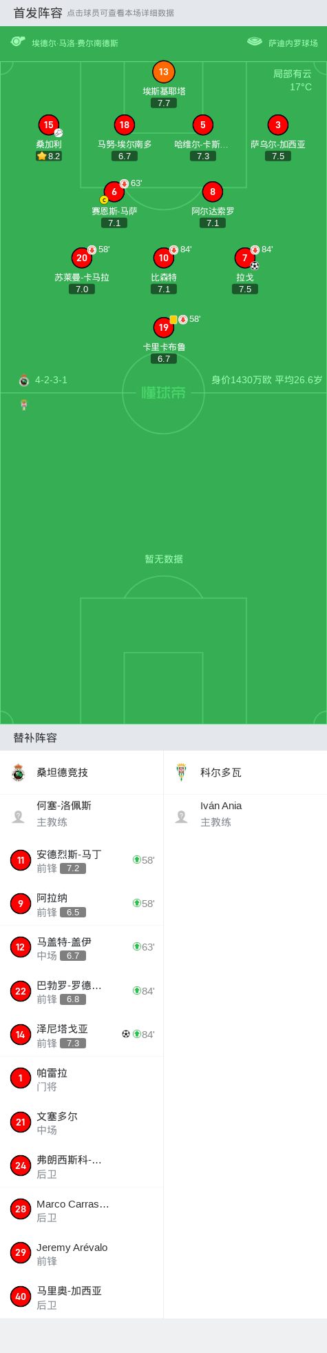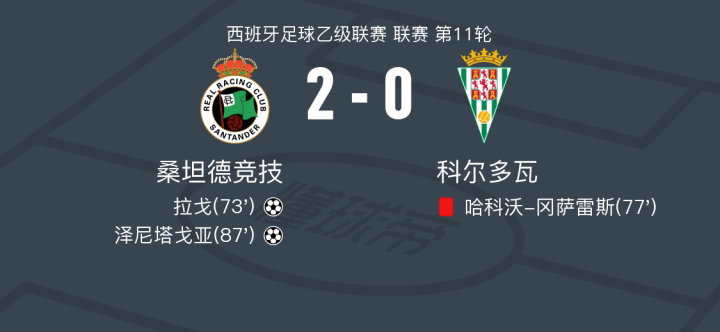 桑坦德竞技2-0科尔多瓦,拉戈建功,泽尼塔戈亚锦上添花