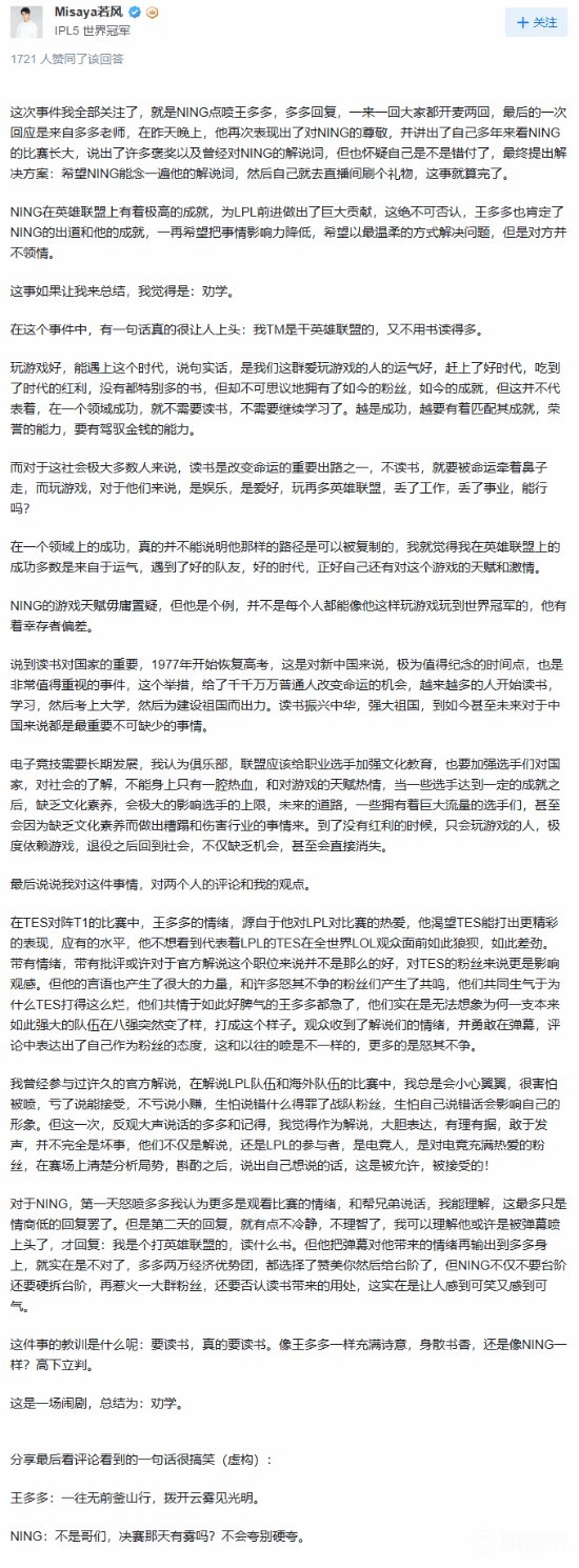 昨晚,前《英雄联盟》职业选手Misaya若风在知乎上发表了对Ning与王多多这次事件的观点——这是一场闹剧,总结为:劝学。