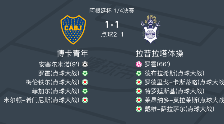 北京时间10月24日阿根廷杯 1/4决赛,博卡青年对阵拉普拉塔体操。博卡青年安塞尔米诺破门,罗霍自摆乌龙。最终比分博卡青年 3-2 拉普拉塔体操。