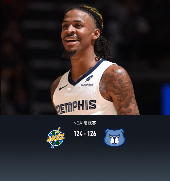 NBA战报:灰熊126-124险胜爵士,莫兰特22+10,伊迪6犯离场