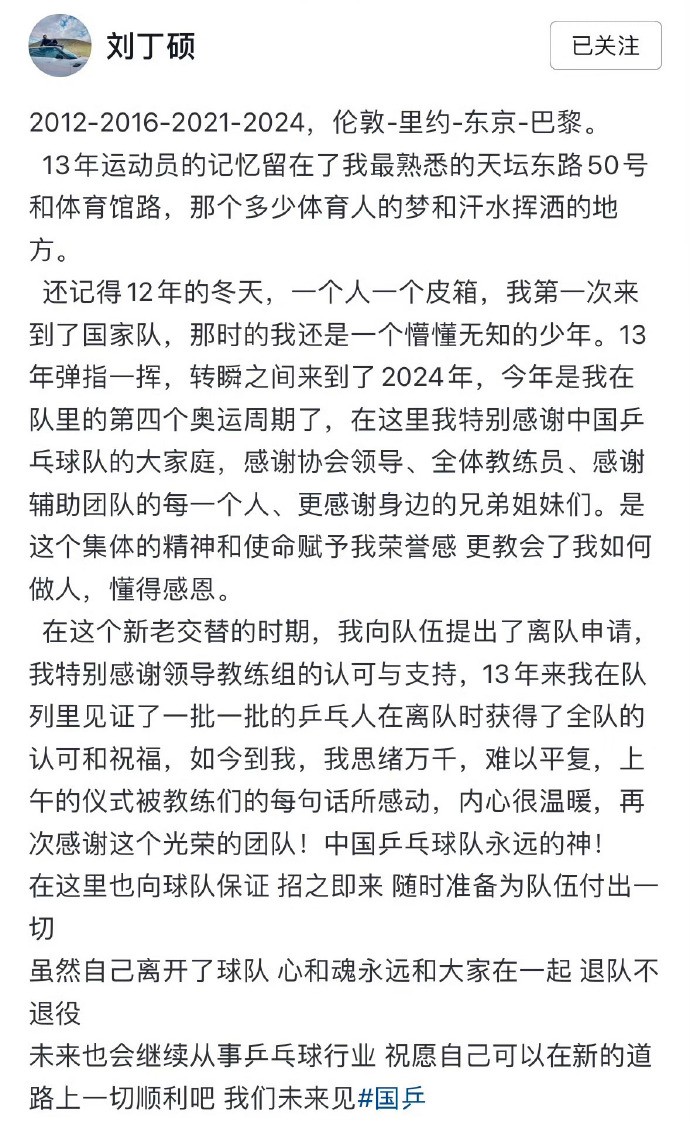 刘丁硕:在这个新老交替的时期,我向队伍提出了离队申请……虽然自己离开了球队,心和魂永远和大家在一起,退队不退役。”随后,王楚钦在评论区祝福刘丁硕:“从小到大的感情,一切的陪伴都在不言中,我们的感情没人能动摇,未来一切都好,你在我也在。