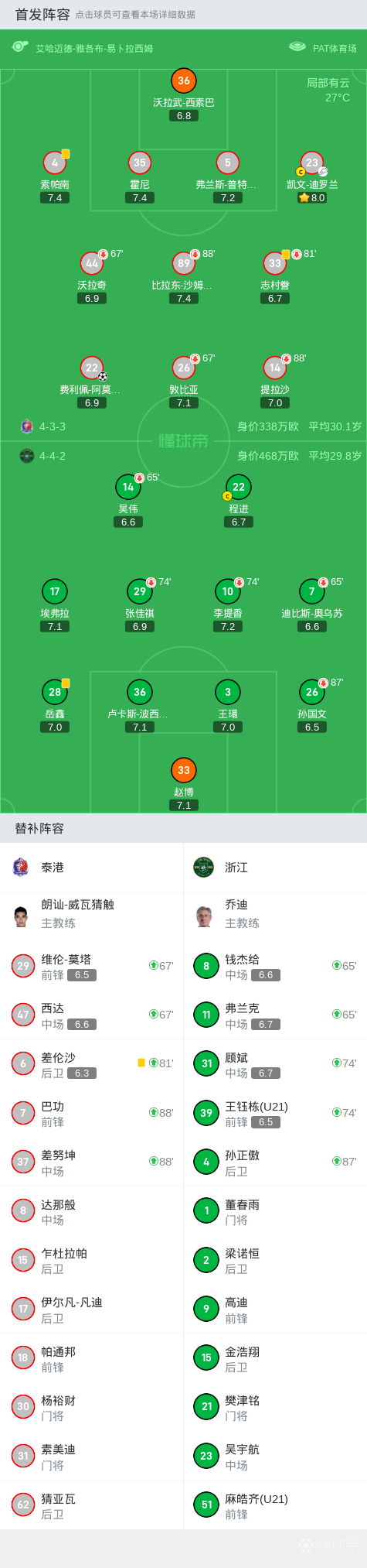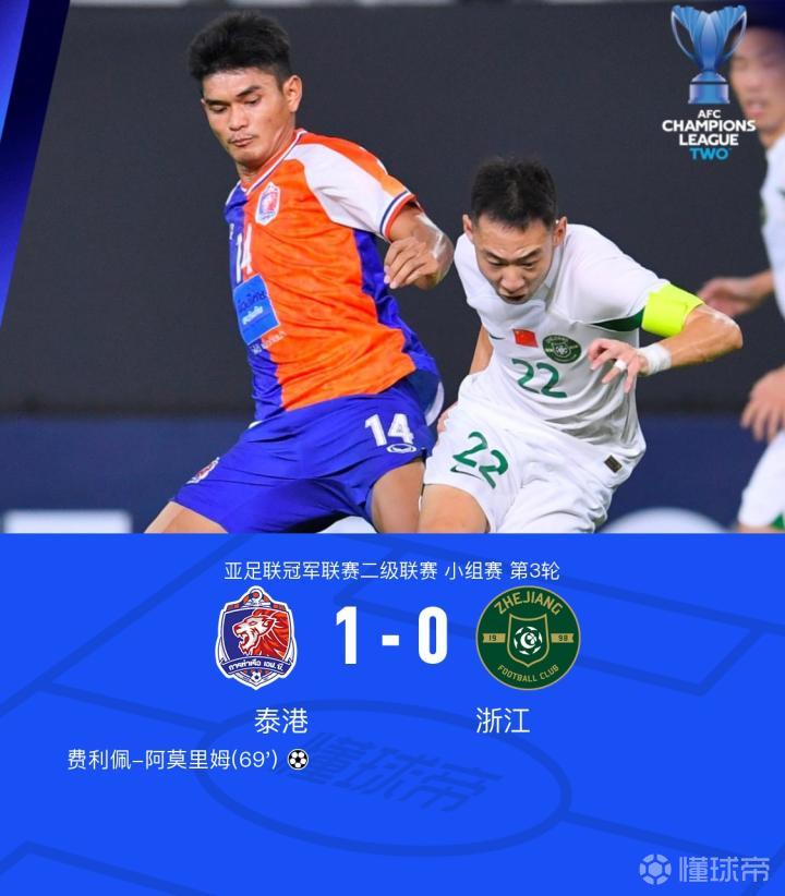 浙江客场0-1泰港,埃弗拉好球被吹越位,阿莫里姆制胜球
