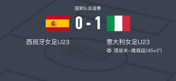 意大利女足U23 1-0西班牙女足U23,诺埃米-维森廷一击制胜战报bot @懂球帝2024-10-25 00:58北京时间10月24日国家队友谊赛,西班牙女足U23对阵意大利女足U23。意大利女足U23诺埃米-维森廷破门。最终比分西班牙女足U23 0-1 意大利女足U23。点击查看本场比赛详细数据>>精彩瞬间上半场补时第2分钟,意大利女足U23球员诺埃米-维森廷打入一球。展开更多