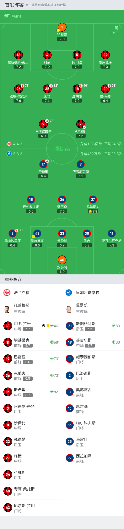 法兰克福1-0里加足球学校,马尔穆什助攻胡戈-拉松制胜
