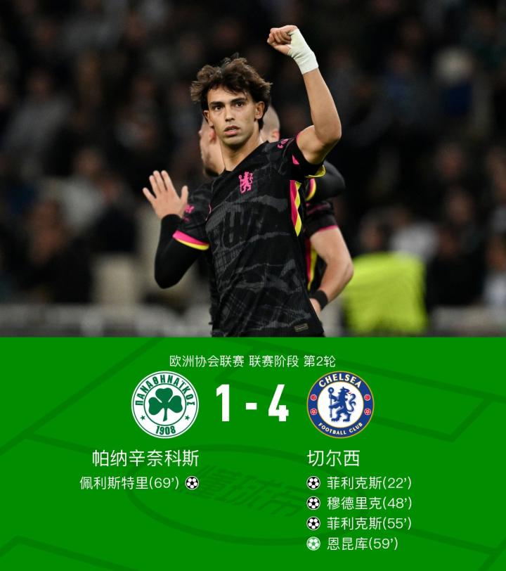 北京时间10月25日0:45,欧协联联赛阶段第二轮,切尔西客场对阵希腊球队帕纳辛奈科斯。上半场,穆德里克助攻菲利克斯破门;下半场,穆德里克再度贡献一传一射,菲利克斯完成双响,随后恩昆库点射建功,佩利斯特里帮助主队扳回一球。最终切尔西客场4-1战胜帕纳辛奈科斯。
